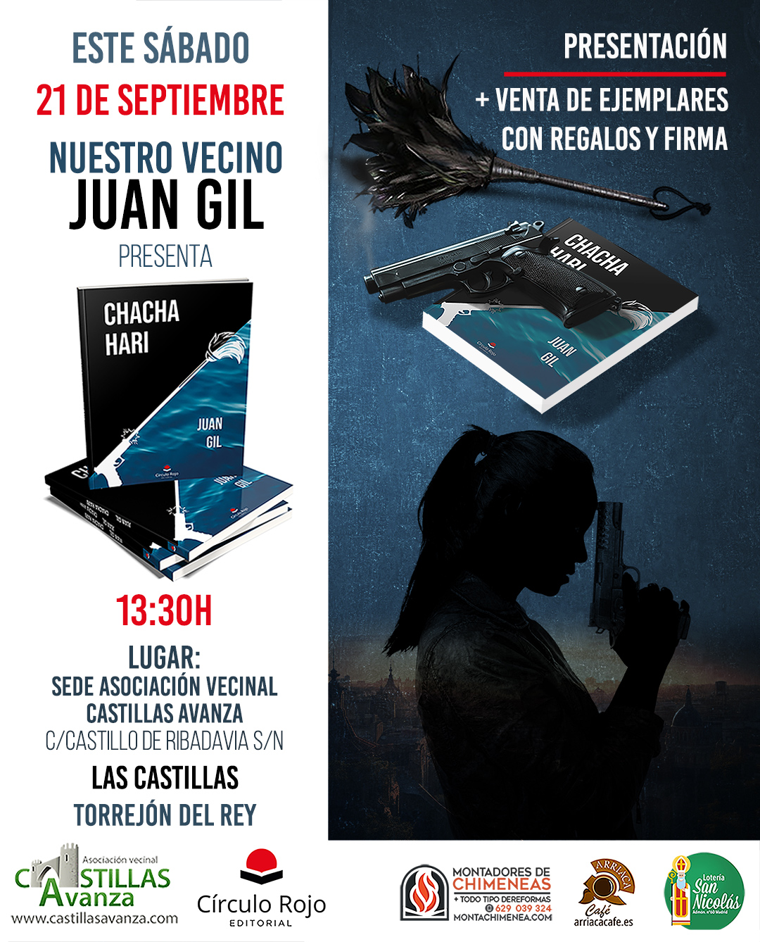 Nos encanta anunciar que este próximo sábado, nuestro vecino, socio y colaborador habitual Juan Gil va a presentar para todos nosotros su primera novela «Chacha Hari» Una novela divertida y original, repleta de humor, acción, y muchas sorpresas. No os perdáis la oportunidad de conocerla directamente de boca de su autor, que de manera amena y cercana nos dará el mejor pie posible para descubrir la historia de Lola.